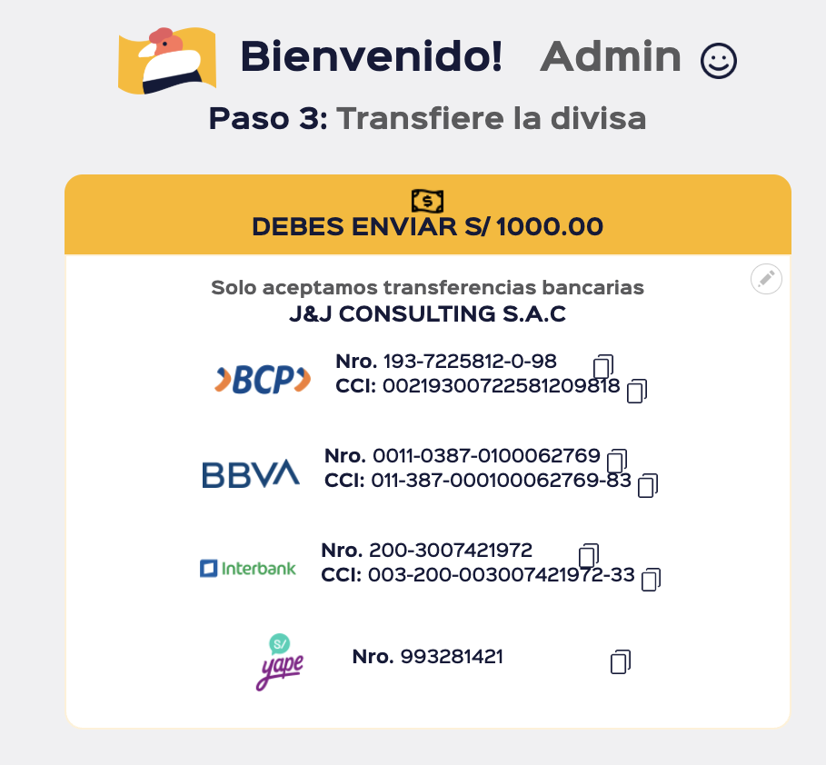 Debes crear una cuenta bancaria donde recibirás el monto de la divisa a cambiar.